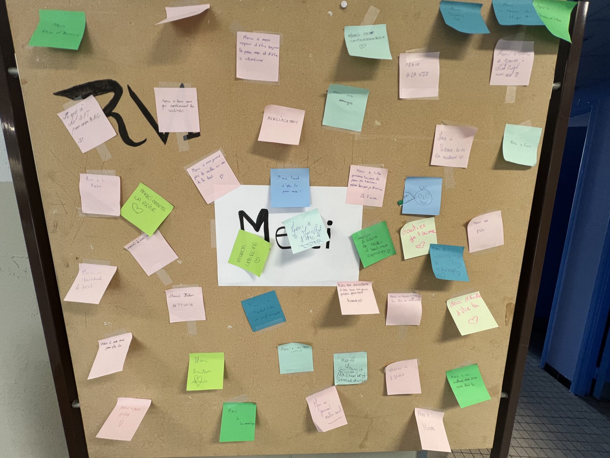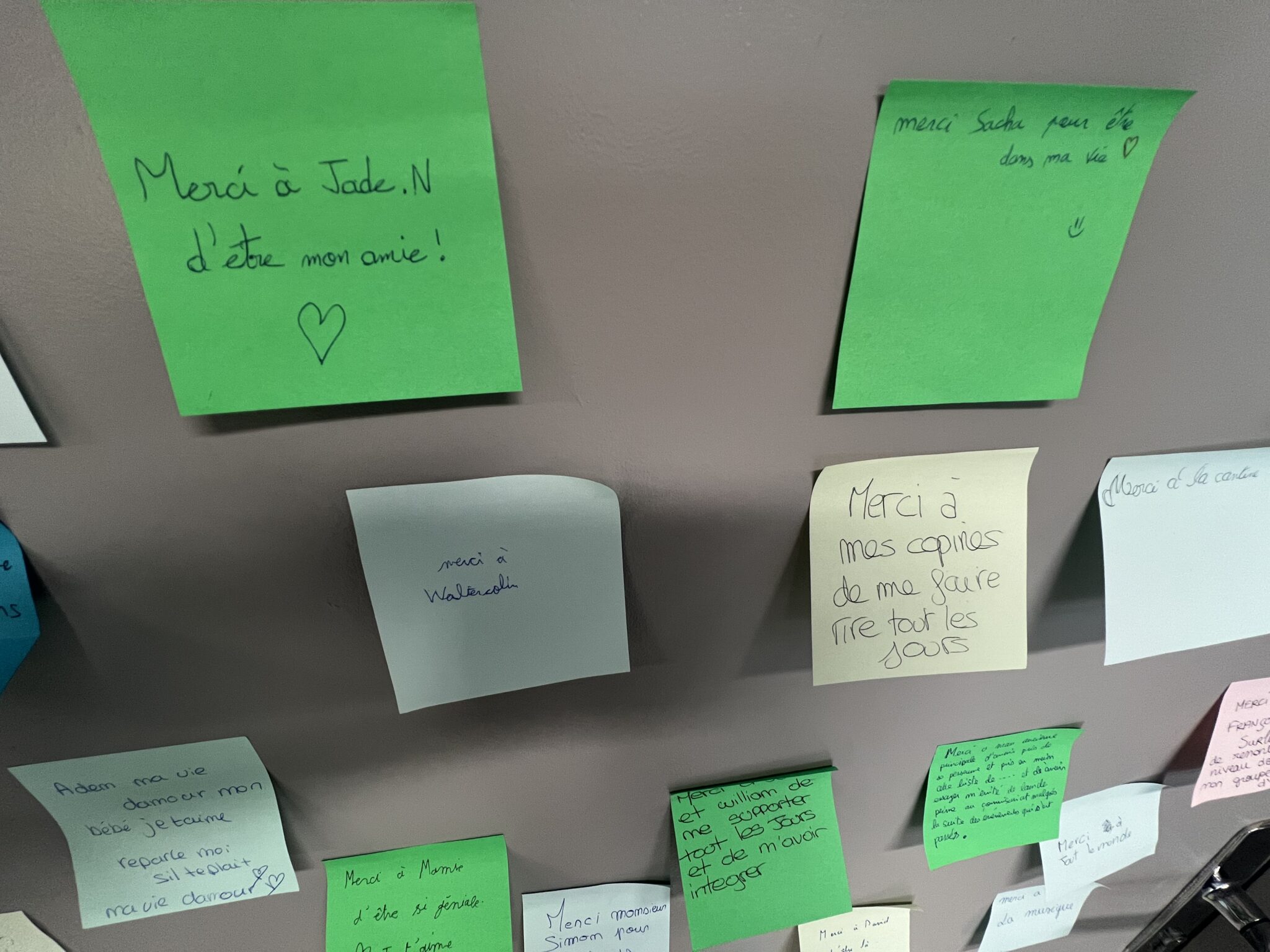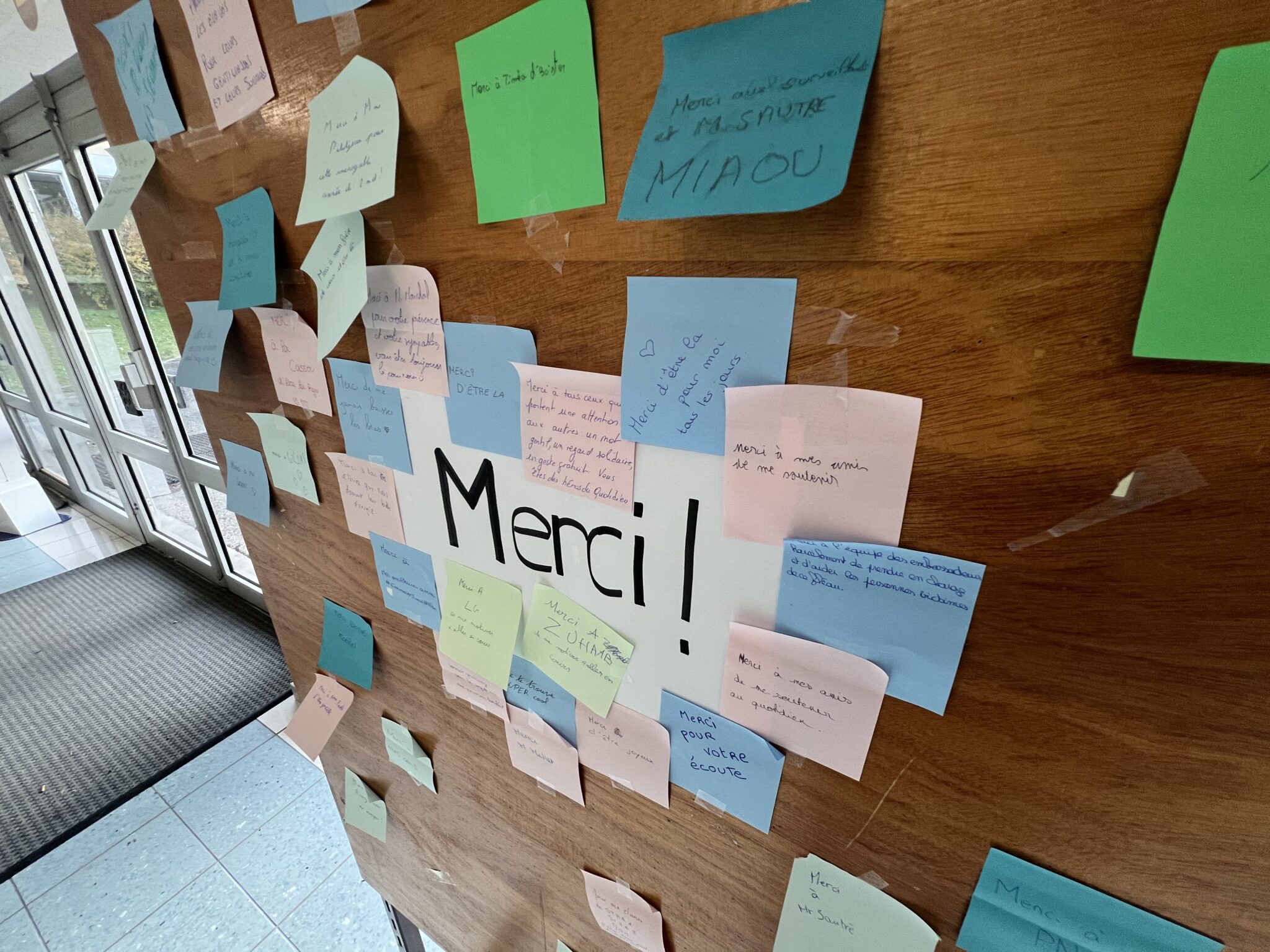 Du côté du lycée, les CPE ont proposé une initiative à laquelle les élèves présents se sont prêtés avec enthousiasme. Ecrire un petit mot de remerciement à une personne choisie sur un post-it et le disposer à l’endroit de leur choix dans le hall d’accueil des élèves.